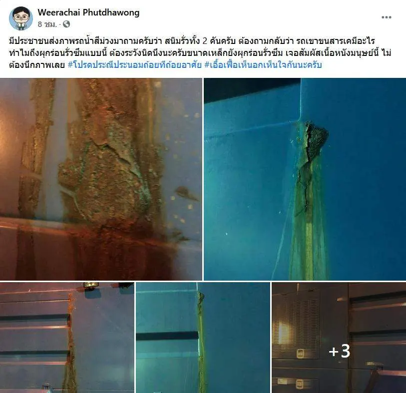 มีประชาชนส่งภาพรถน้ำสีม่วงมาถามครับว่า สนิมรั่วทั้ง 2 คันครับ ต้องถามกลับว่า รถเขาขนสารเคมีอะไร ทำไมถึงผุกร่อนรั่วซึมแบบนี้ ต้องระวังนิดนึงนะครับขนาดเหล็กยังผุกร่อนรั่วซึม เจอสัมผัสเนื้อหนังมนุษย์นี้ ไม่ต้องนึกภาพเลย #โปรดประณีประนอมถ้อยทีถ้อยอาศัย #เอื้อเฟื้อเห็นอกเห็นใจกันนะครับ