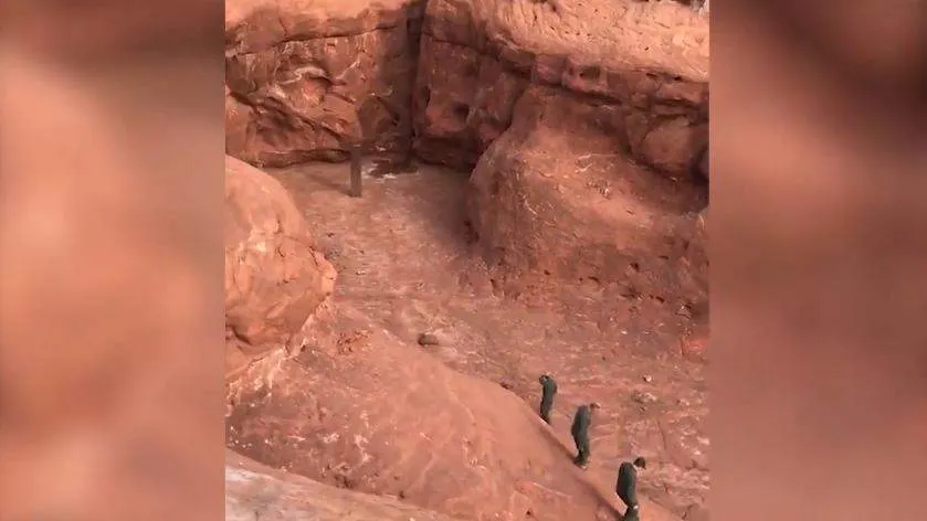 แต่จู่ๆ ก็เห็นเสาโลหะสุดพิสดารในซอกเขา เลยนำทีมเข้าตรวจสอบ และพบว่าเสาโลหะมีขนาดสูงราว 300-365 เซนติเมตร ผิวโลหะมีความแวววาว และตั้งอยู่บนพื้นอย่างมั่นคง ซึ่งนั่นหมายความว่าเสาโลหะนี้ไม่ได้หล่นลงมาจากด้านบนและปักลงในทราย