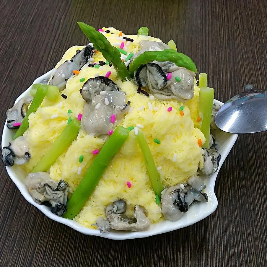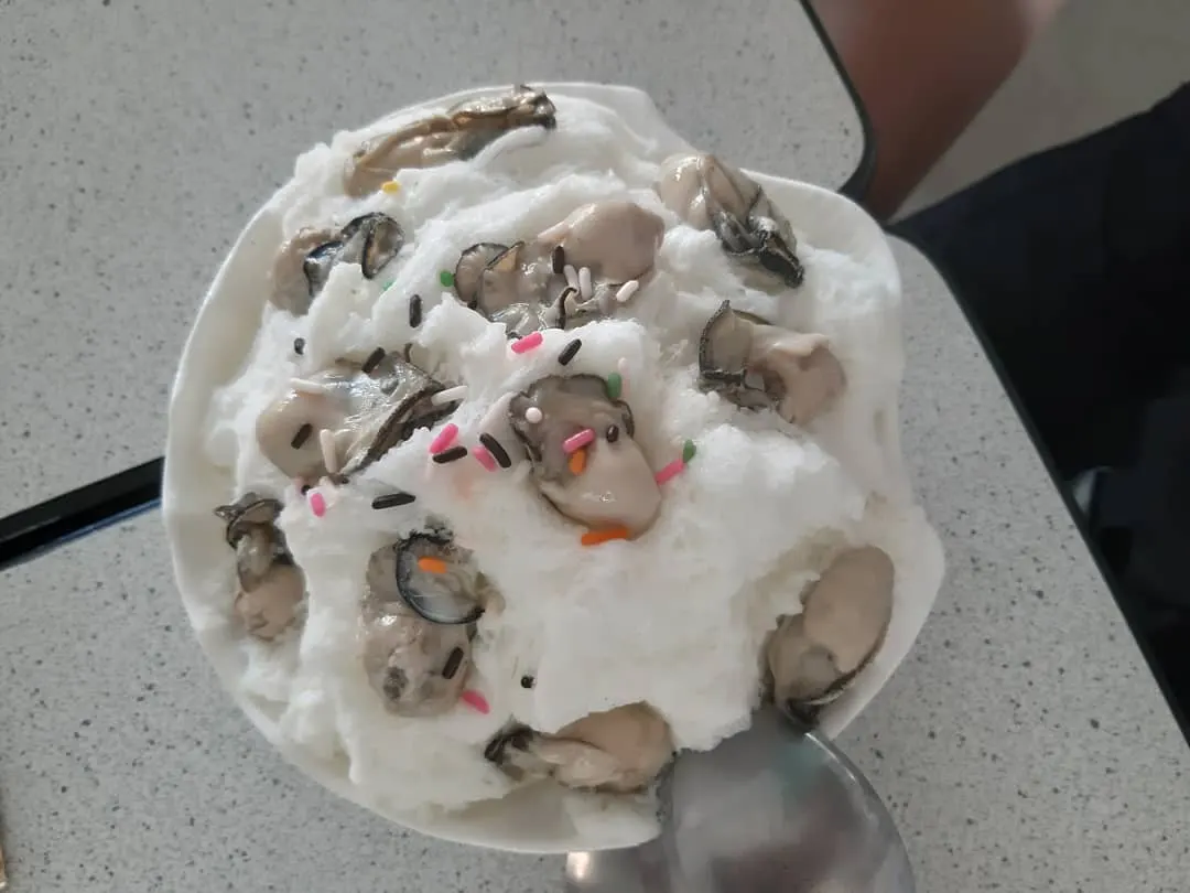 แต่ล่าสุด ในโลกโซเชียลได้มีการแชร์ภาพน้ำแข็งไสของร้านอาหารร้านหนึ่งในไต้หวัน ที่แปลกตาเพราะว่าราดหน้าด้วยหอยนางรมสดๆ คือเมนูของหวานจากร้าน 王者之蚵海洋冰藝館 ในเขตท่าเรือ Wanggong มณฑลจางฮั่ว ซึ่งในพื้นที่บริเวณน่านน้ำโดยรอบนั้นอุดมไปด้วยหอยนางรมอยู่แล้ว