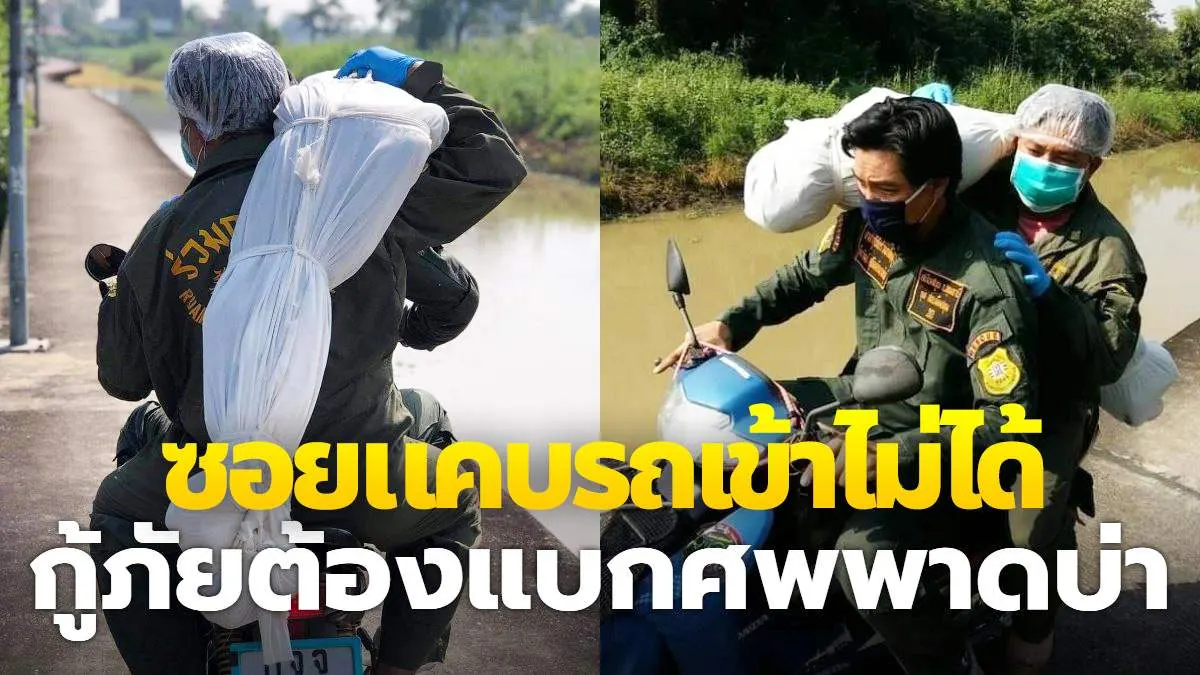 ทุลักทุเลสุด! กู้ภัยเข้าเก็บศพในซอยแคบ แบกพาดบ่าขึ้น จยย. สุดยากลำบาก
