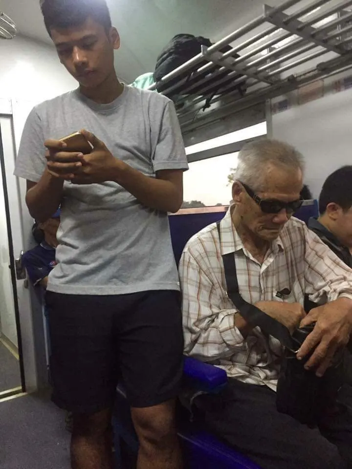 คุณตาในภาพเป็นผู้พิการทางสายตา ขึ้นรถไฟจากสถานีเมืองนครราชสีมา ปลายทางของคุณตาคือสถานีรถไฟบ้านภาชี คุณตาขึ้นรถไฟมาถึงสถานีปากช่อง ปรากฎว่ามีเจ้าของที่นั่งมาทวงที่นั่งคืนจากคุณตา โดยไม่สนใจเลยว่าคุณตานั้นมองไม่เห็น หลังจากนั้นคุณตาก็ลุกให้เจ้าของที่ตัวจริงเขานั่ง แล้วคุณตาก็ยืนนิ่งอยู่อย่างนั้น คงจะกลัวเดินไม่ถูกหรือกลัวล้มเป็นแน่แท้