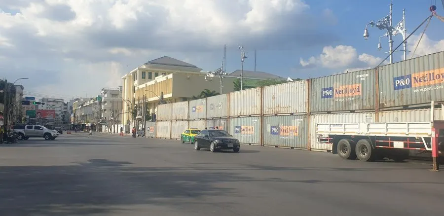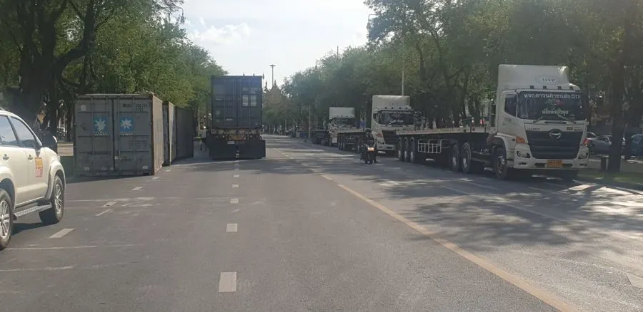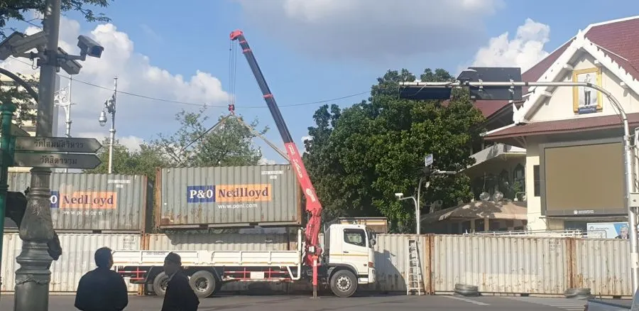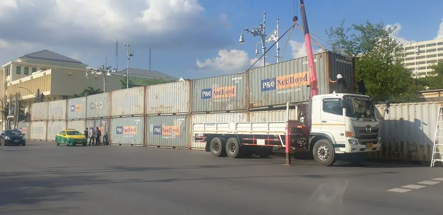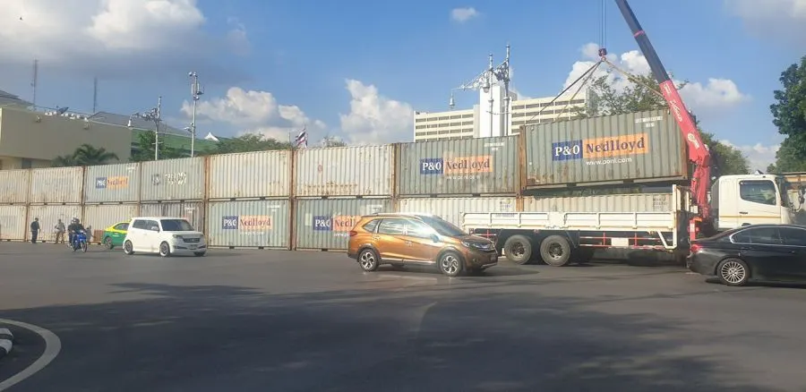 ขนมาเพิ่ม! ตู้คอนเทรนเยอร์จำนวนมากโผล่ จปร. ใกล้กระทรวงเกษตรและสหกรณ์ ปิดกั้นไม่ให้เข้าไปยังสะพานมฆวานได้