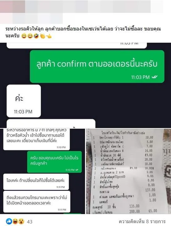 ลูกค้าสาวสุดน่ารัก กลัวแกร็ปหิว บอกให้ซื้อของกินระหว่างรอคิว แล้วมาเก็บเงินที่ตน