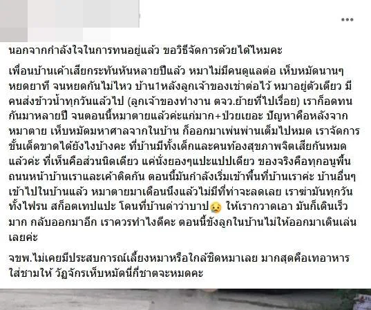 เพื่อนบ้านเค้าเสียกระทันหันหลายปีแล้ว หมาไม่มีคนดูแลต่อ เห็บหมัดนานๆหยดยาที จนหยดกันไม่ไหว บ้าน1หลังลูกเจ้าของเช่าต่อไว้ หมาอยู่ตัวเดียว มีคนส่งข้าวน้ำทุกวันแล้วไป (ลูกเจ้าของทำงาน ตจว.ย้ายที่ไปเรื่อย) เราก็อดทนกันมาหลายปี จนตอนนี้หมาตายแล้วค่ะแก่มาก+ป่วยเยอะ ปัญหาคือหลังจากหมาตาย เห็บหมัดมหาศาลจากในบ้าน ก็ออกมาเพ่นพ่านเต็มไปหมด เราจัดการขั้นเด็ดขาดได้ยังไงบ้างคะ ที่บ้านมีทั้งเด็กและคนท้องสุขภาพจิตเสียกันหมดแล้วค่ะ ที่เห็นคือส่วนนิดเดียว แค่นั่งยองๆแปะแปปเดียว ของจริงคือทุกอนูพื้นถนนหน้าบ้านเราและเค้าติดกัน ตอนนี้มันกำลังเริ่มเข้าพื้นที่บ้านเราค่ะ บ้านอื่นๆเข้าไปในบ้านแล้ว หมาตายมาเดือนนึงแล้วไม่มีที่ท่าจะลดเลย เราฆ่ามันทุกวันทั้งไฟรน สก็อตเทปแปะ โดนที่บ้านด่าว่าบาป