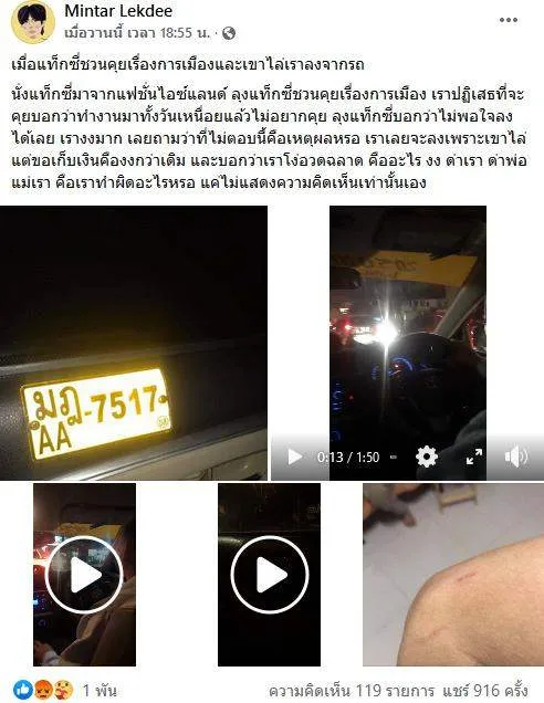 นั่งแท็กซี่มาจากแฟชั่นไอซ์แลนด์ ลุงแท็กซี่ชวนคุยเรื่องการเมือง เราปฏิเสธที่จะคุยบอกว่าทำงานมาทั้งวันเหนื่อยแล้วไม่อยากคุย ลุงแท็กซี่บอกว่าไม่พอใจลงได้เลย เรางงมาก เลยถามว่าที่ไม่ตอบนี้คือเหตุผลหรอ เราเลยจะลงเพราะเขาไล่ แต่ขอเก็บเงินคืองงกว่าเดิม และบอกว่าเราโง่อวดฉลาด คืออะไร งง ด่าเรา ด่าพ่อแม่เรา คือเราทำผิดอะไรหรอ แค่ไม่แสดงความคิดเห็นเท่านั้นเอง