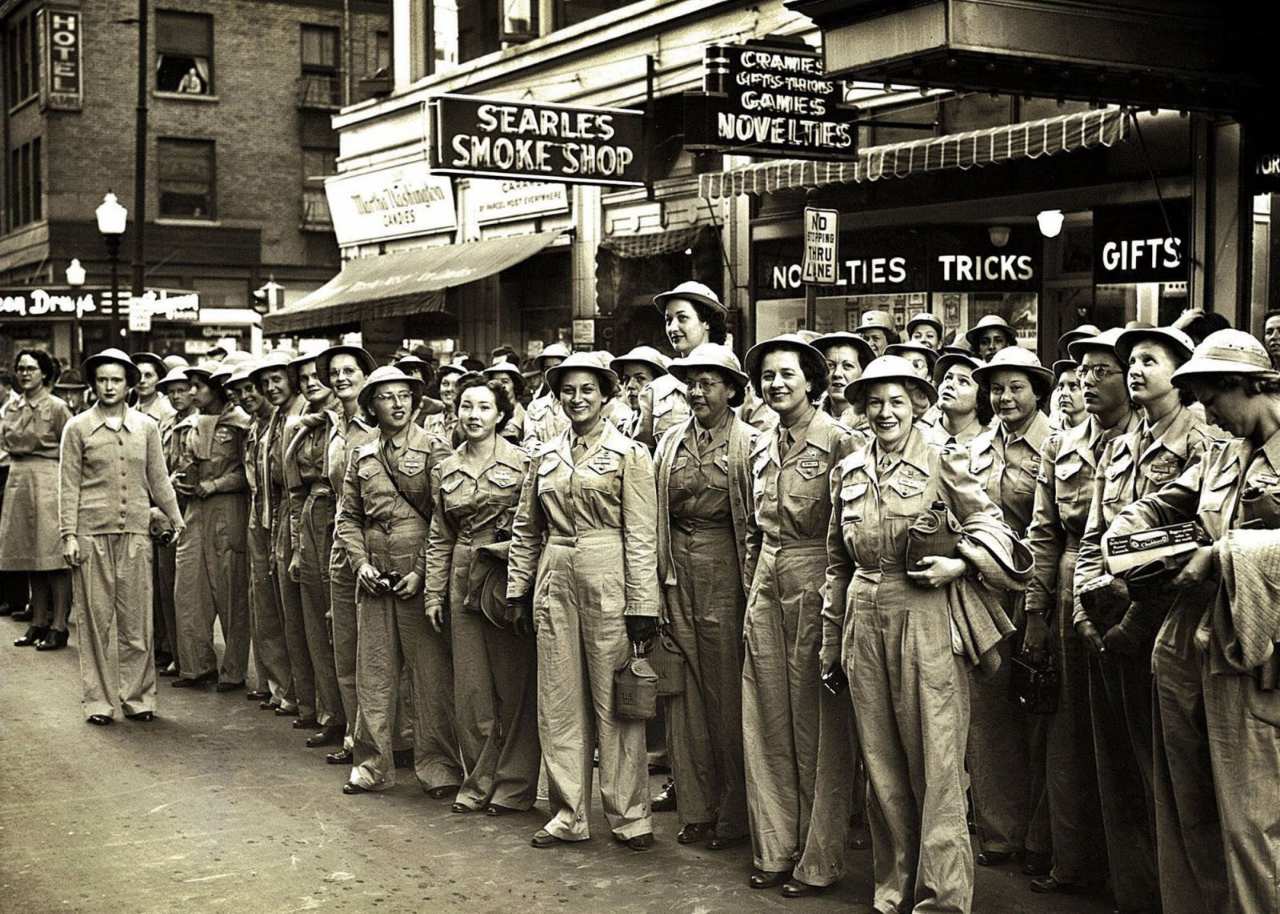 ผู้หญิงที่มีกองกำลังเสริม ของกองทัพรอรถเข็น ในย่านใจกลางเมืองดิมอยน์ รัฐไอโอวา ห้าเดือนหลังจากสภาคองเกรส ผ่านร่างกฎหมายอนุญาตหน้าที่ ทางทหารที่ไม่ใช่การต่อสู้สำหรับผู้หญิง กฎหมาย 1942 อนุญาตให้ผู้หญิงเข้าร่วมสงครามได้ อย่างมีประสิทธิภาพในบทบาทต่างๆ เช่น เจ้าหน้าที่วิทยุ และ ผู้ควบคุมการจราจรทางอากาศ ทะเบียน Des Moines / AP