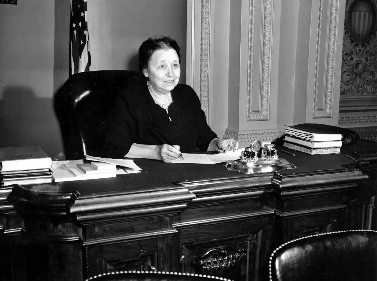 วุฒิสมาชิกสหรัฐ Hattie Caraway ลงนามในกฎหมาย เมื่อวันที่ 19 ตุลาคม พ.ศ. 2486 สร้างประวัติศาสตร์ในฐานะผู้หญิงคนแรก ที่รับหน้าที่เป็นประธานวุฒิสภา Caraway ซึ่งเป็นตัวแทนของรัฐอาร์คันซอ ได้เข้าสู่วุฒิสภาครั้งแรก โดยการแต่งตั้งหลังจากที่ สามีของเธอ ส.ว. ทัดคารเวย์สามีของเธอเสียชีวิต หลังจากรับใช้แทนสามีของเธอ Caraway ทำให้หัวหน้าพรรคประหลาดใจ ด้วยการประกาศการลงสมัคร รับเลือกตั้งของเธอเองครบวาระ เธอชนะการเลือกตั้งอย่างถล่มทลาย กลายเป็นผู้หญิงคนแรก ที่ได้รับเลือกให้เป็นวุฒิสภา AP