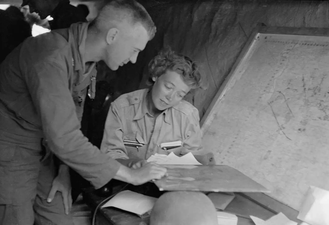 ผู้สื่อข่าว Marguerite Higgins เป็นผู้บุกเบิก สำหรับนักข่าวหญิง และผู้สื่อข่าวสงคราม เธอกล่าวถึงการปลดปล่อย Dachau ให้กับ New York Herald Tribune ในช่วงสงครามโลกครั้งที่สอง และเธอเป็นหนึ่งในผู้หญิงไม่กี่คน ที่อยู่แนวหน้าในช่วงสงครามเกาหลี ในภาพเธอกำลังจดบันทึกกับ พ.อ. John "Mike" Michaelis ขณะรับมอบหมายงานในปี 2493 หนึ่งปีต่อ มาฮิกกินส์กลายเป็นผู้หญิงคนแรก ที่ได้รับรางวัลพูลิตเซอร์ จากการรายงาน ระดับนานาชาติ Carl Mydans / The LIFE Picture Collection / Getty Images