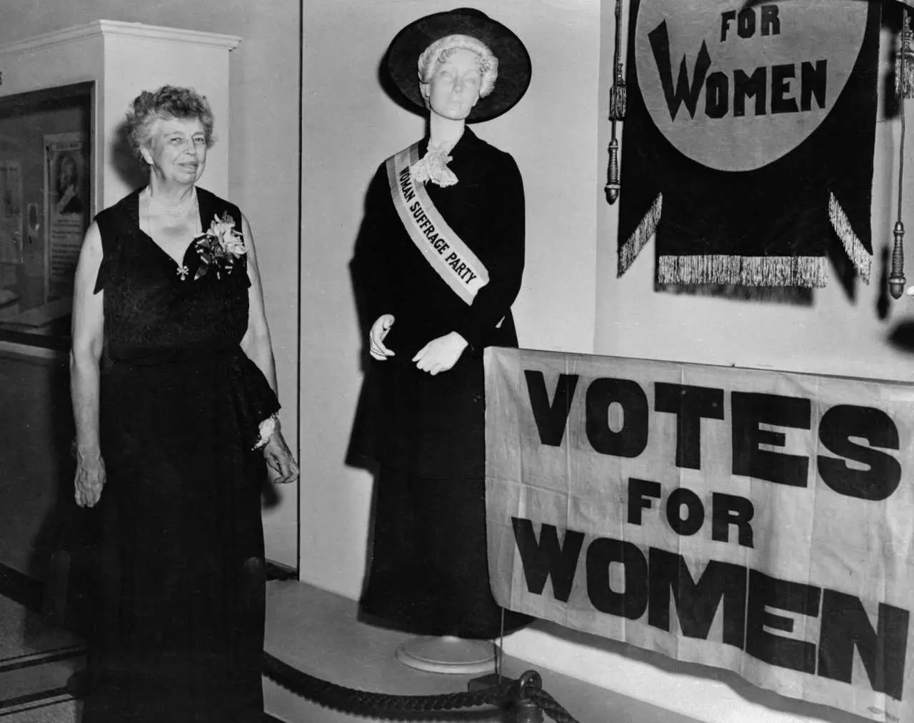อดีตสุภาพสตรีหมายเลขหนึ่ง "เอลีนอร์ รูสเวลต์" เยี่ยมชมนิทรรศการ Vote for Women ที่สมาคมประวัติศาสตร์นิวยอร์ก ในปี 2495 บ่อยครั้งที่ได้รับการยกย่องว่าเป็น "สุภาพสตรีหมายเลขหนึ่งของโลก" รูสเวลต์เป็นหนึ่งในสุภาพสตรีหมายเลขหนึ่ง ที่มีบทบาททางการเมืองมากที่สุด ที่ก้าวเท้าเข้าสู่ทำเนียบขาว เธอดำรงตำแหน่งในคณะ กรรมาธิการสิทธิมนุษยชนแห่งสหประชาชาติ และสนับสนุนให้ประธานาธิบดี "แฟรงคลิน รูสเวลต์" สามีของเธอแต่งตั้งผู้หญิง ให้ดำรงตำแหน่งระดับรัฐบาลกลาง "การต่อสู้เพื่อสิทธิส่วนบุคคล ของผู้หญิงถือเป็นเรื่องที่มีมายาวนาน และไม่มีใครในพวกเรา ควรเผชิญหน้ากับสิ่งที่ทำลายมัน" เธอเขียนในคอลัมน์ "วันของฉัน" รายสัปดาห์ของเธอ Bettmann Archive / Getty Images