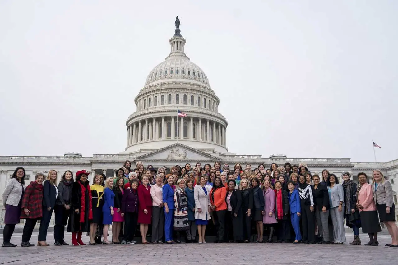 สมาชิกสภาคองเกรสหญิง ที่เป็นประชาธิปไตย ร่วมกันโพสท่านอกรัฐสภาสหรัฐ ในปี 2019 จากอเล็กซานเดรียโอคาซิโอ คอร์เตซผู้หญิงอายุน้อยที่สุด ที่เคยได้รับเลือกให้เข้ารับตำแหน่ง ในสภาไปจนถึงราชิดาทาไลบ และอิลฮานโอมาร์สตรีมุสลิมคนแรก ที่ได้รับเลือกเข้าสู่สภาคองเกรสกลุ่มที่ 116 รวมถึงการทำลายสถิติ 101 ผู้หญิง Erin Schaff / The New York Times / Redux