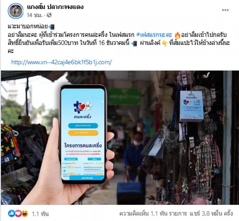 อย่าลืมนะคะ ผู้ที่เข้าร่วมโครงการคนล่ะครึ่ง ในเฟสแรก #เฟสแรกนะคะ อย่าลืมเข้าไปกดรับสิทธิ์ยืนยันเพื่อรับเพิ่ม500บาท ในวันที่ 16 ธันวาคมนี้ ผ่านลิงค์ ที่แปะไว้ให้ข้างล่างนี้นะคะ
