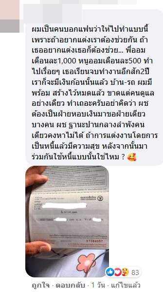 ผมเป็นคนบอกแฟนว่าให้ไปทำแบบนี้เพราะถ้าอยากแต่งเราต้องช่วยกัน ถ้าเธออยากแต่งเธอก็ต้องช่วย... พี่ออมเดือนละ1,000 หนูออมเดือนละ500 ทำไปเรื่อยๆ เธอเรียนจบทำงานอีกสัก2ปีเราก็จะมีเงินก้อนนั้นแล้ว บ้าน-รถ ผมมีพร้อม สร้างไว้หมดแล้ว ขาดแต่คนดูแลอย่างเดียว ทำเถอะครับอย่าคิดว่า ผช ต้องเป็นฝ่ายหอบเงินมาขอฝ่ายเดียว บางคน ผช ฐานะปานกลางลำพังคนเดียวคงหาไม่ได้ ถ้าการแต่งงานโดยการเป็นหนี้แล้วมีความสุข หลังจากนั้นมาร่วมกันใช้หนี้แบบนั้นใช่ไหม ?