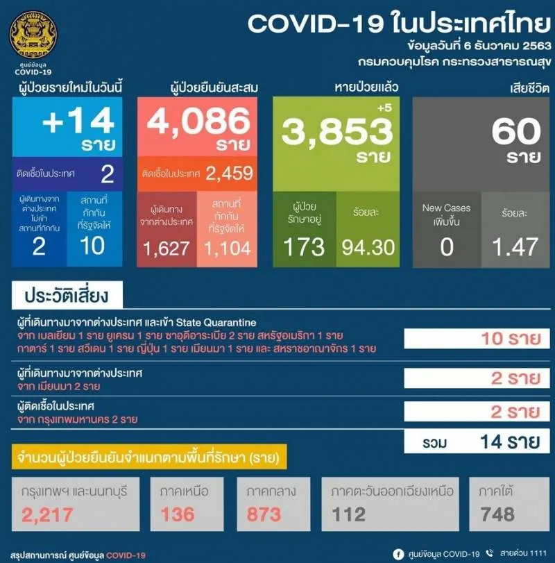วันที่ 6 ธ.ค. 63 ศูนย์บริหารสถานการณ์โควิด-19 (ศบค.) รายงานสถานการณ์แพร่ระบาดโรคโควิด-19 ในประเทศไทย ล่าสุด พบผู้ป่วยรายใหม่เพิ่มขึ้น 14 ราย ยอดรวมผู้ติดเชื้อสะสม 4,086 ราย หายป่วยทั้งหมด 3,853 ราย รักษาอยู่ใน รพ. 173 ราย และไม่มีผู้เสียชีวิตเพิ่ม รวมมีผู้เสียชีวิตยังอยู่ที่ 60 ราย