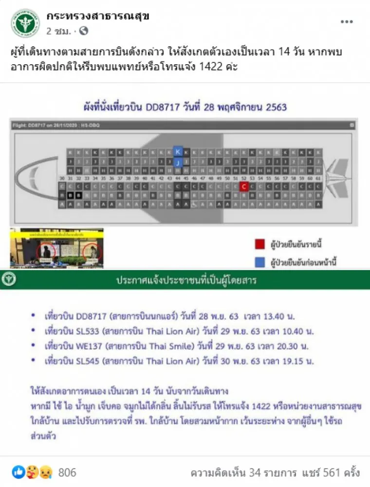 6 ธันวาคม 2563 เฟซบุ๊กเพจ กระทรวงสาธารณสุข ได้โพสต์ภาพเตือนพร้อมระบุข้อความว่า ผู้ที่เดินทางตามสายการบินดังกล่าว ให้สังเกตตัวเองเป็นเวลา 14 วัน หากพบอาการผิดปกติให้รีบพบแพทย์หรือโทรแจ้ง 1422 ค่ะ