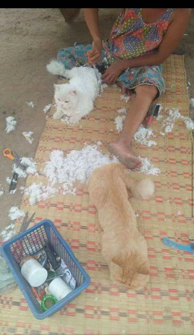 ฝีมือการตัดขนแมวของคุณแม่เรียกได้ว่าสุดยอด ตัดจนเป็นขั้นบันไดกันเลยทีเดียว แถมเจ้าเหมียวสองตัวก็แสนรู้งาน ยอมนอนนิ่งๆให้คุณแม่เนรมิตขนใหม่ให้ไม่มีอิดออด