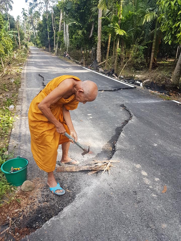 หลวงพ่อทนไม่ไหว! ลงมือซ่อมถนนเอง หลังยุบเป็นหลุม หวั่นเกิดอันตรายกับญาติโยมที่ขับไปวัด