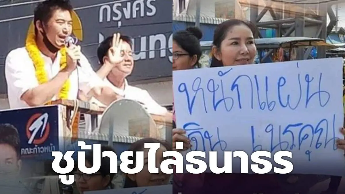 นายธนาธร จึงรุ่งเรืองกิจ ลงพื้นที่ชหาเสียงช่วยลูกพรรคผู้สมัครนายก อบจ. พื้นที่จังหวัดกำแพงเพชร โดนชาวบ้านในพื้นที่ชูป้าย "หนักแผ่นดิน"