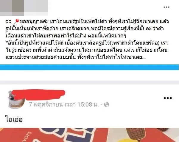 ขออนุญาตค่ะ เราโดนแชร์รูปในเฟสไปด่า ทั้งๆที่เราไม่รู้จักเขาเลย แล้วรูปนั้นเห็นหน้าเราชัดด้วย เราเครียดมาก พอมีใครมีความรู้เรื่องนี้มั้ยคะ ว่าถ้าเตือนแล้วเขาไม่ลบเราพอทำไรได้บ้าง ตอนนี้แพนิคมากๆ