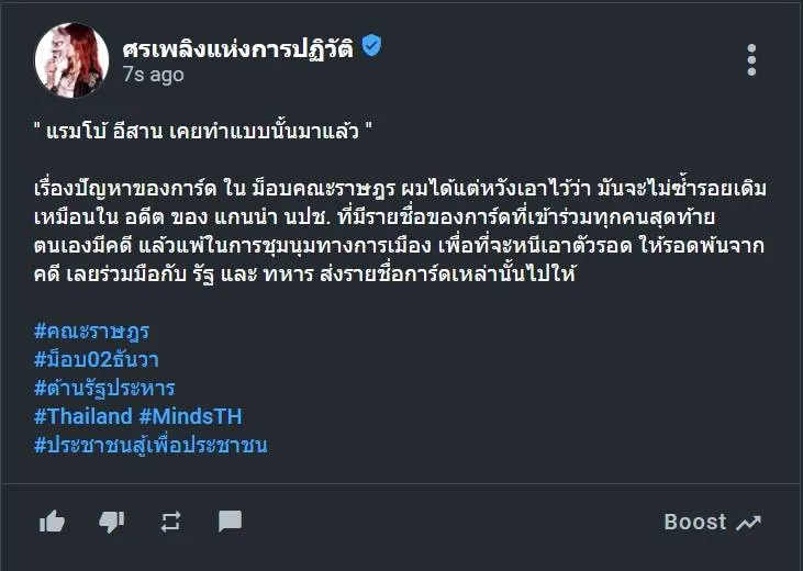 วันที่ไร้ภารกิจ : นายสมบัติ ทองย้อย แกนนำการ์ด นปช. ที่ร่วมเป็นการ์ดในคณะราษฎร หลังออกมาเปิดโปงยุบการ์ดอาสา มาใช้บริการบริษัทการ์ด เอาเงินหนุนม็อบไปว่าจ้าง จนถูกมวลชนหนุนม็อบราษฎร เข้าไปอาละวาด ด่าทอในโซเชียล ท้ายที่สุด ก็สั่งการ์ดเสื้อแดงยุติบทบาท และบอกว่า จงภูมิใจ แม้ถูกมองเป็นตัวปัญหา