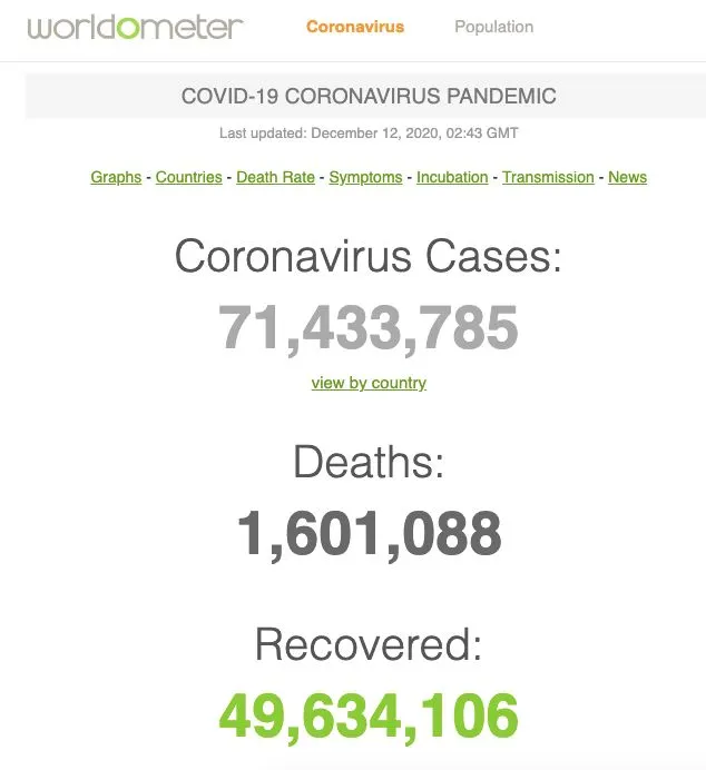 เมื่อวานทั่วโลกติดเพิ่ม 684,490 คน รวมแล้วตอนนี้ 71,333,628 คน ตายเพิ่มอีก 12,324 คน ยอดตายรวม 1,599,315 คน