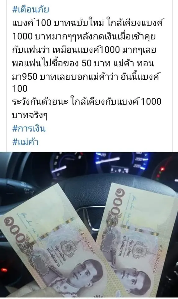 หนุ่มโพสต์เตือนภัย!! หลังใช้แบงค์ 100 ใหม่ จ่ายเงิน ใกล้เคียงแบงค์ 1,000 บาทมากๆ โปรดมองดีๆ ก่อนใช้จ่ายทุกครั้ง