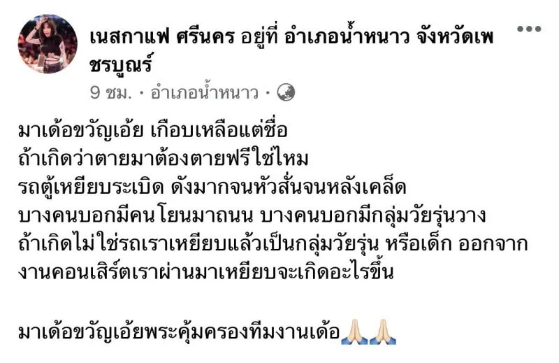 ทำเอาใจหายใจคว่ำ เมื่อนักร้องสาว เนสกาแฟ ศรีนคร ได้โพสต์บอกเล่าเรื่องราวความระทึกหลังกลับจากแสดงคอนเสิร์ตเมื่อค่ำคืนที่ผ่านมาให้ฟังว่า