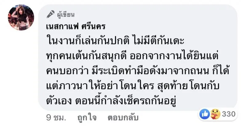 ทั้งนี้เจ้าตัวยังได้เผยต่อด้วยว่า ในงานก็เล่นกันปกติ ไม่มีตีกันเดะ ทุกคนเต้นกันสนุกดี ออกจากงานได้ยินแต่คนบอกว่า มีระเบิดทำมือดังมาจากถนน ก็ได้แต่ภาวนาให้อย่าโดนใคร สุดท้ายโดนกับตัวเอง ตอนนี้กำลังเช็ครถกันอยู่ และ ฟาดเคราะห์เด้อเรา หน้าพ่อกับแม่ลอยมาเลยอ่ะ
