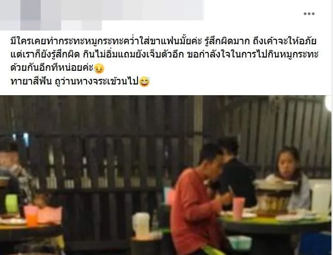 มีใครเคยทำกระทะหมูกระทะคว่ำใส่ขาแฟนมั้ยค่ะ รู้สึกผิดมาก ถึงเค้าจะให้อภัยแต่เราก็ยังรู้สึกผิด กินไม่อิ่มแถมยังเจ็บตัวอีก ขอกำลังใจในการไปกินหมูกระทะด้วยกันอีกทีหน่อยค่ะ