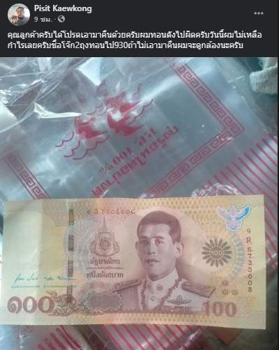 คุณลูกค้าครับได้โปรดเอามาคืนด้วยครับผมทอนตังไปผิดครับวันนี้ผมไม่เหลือกำไรเลยครับชื่อโจ๊ก2ถุงทอนไป930ถ้าไม่เอามาคืนผมจะดูกล้องนะครับ ทั้งนี้ หลังจากภาพดังกล่าวถูกโพสต์ลงในโลกออนไลน์ ได้มีชาวเน็ตเข้ามาคอมเมนต์แสดงความเห็นใจต่อเจ้าของโพสต์กันเป็นจำนวนมาก พร้อมกับแนะนำให้ผู้โพสต์ต่อไปลองสังเกตที่ตัวเลขบนธนบัตรจะได้ไม่เกิดข้อผิดพลาดอย่างกรณีนี้อีก
