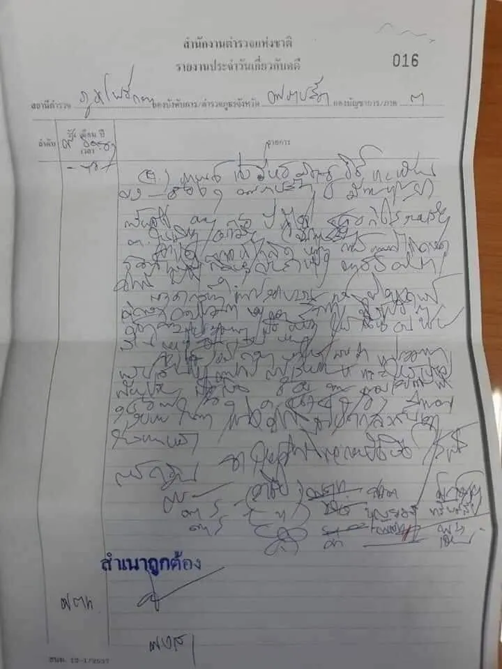 ผู้ใช้เฟสบุ๊ครายหนึ่งรายงานว่า ไปแจ้งความแต่กลับเจอข้อความแบบนี้ สามารถอ่านได้หรือไม่ อ่านว่าอย่างไร ในใบแจ้งความ