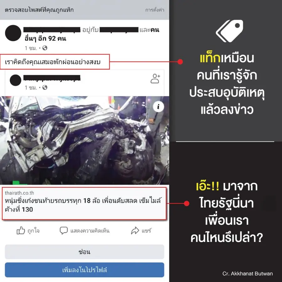 เตือนภัย : ช่วงนี้มีวิธีการหลอกถามรหัสเฟสบุคง่ายๆ ด้วยการแท็คชื่อของคุณ พร้อมด้วยเว็บปลอมข่าวต่างๆ เช่น รถชน/คนตาย ฯลฯ และใส่แคปชั่นประหนึ่งคนในข่าวเป็นคนรู้จักของคุณ~