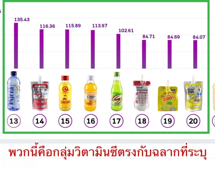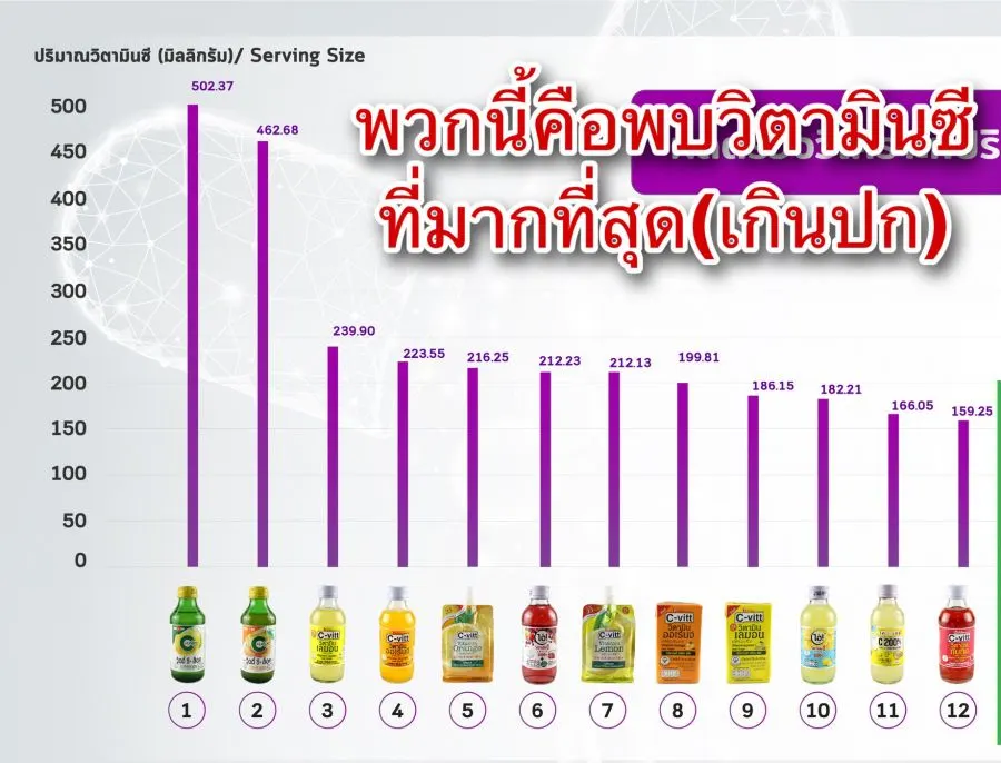 เมื่อวานมีผลการสุมตรวจเครื่องดื่มผสมวิตามินซีจำนวน 47 ตัวอย่าง ของมูลนิธิคุ้มครองผู้บริโภค พบว่ามีหลายยี่ห้อไม่มีวิตามินซีตามที่ระบุจริงและหลายยี่ห้อมีเกินกว่าฉลาก