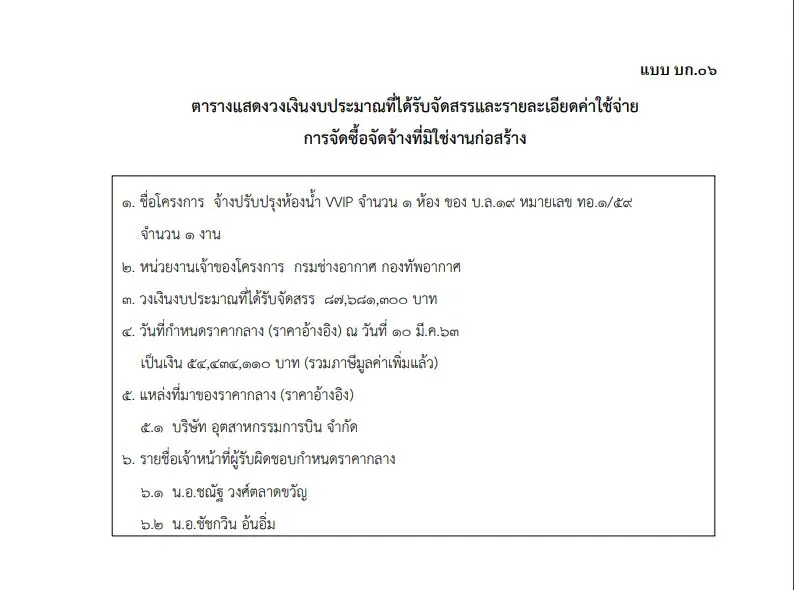 เปิดเอกสารกรมช่างอากาศ กองทัพอากาศ ระบุวงเงินงบประมาณจัดซื้อจัดจ้างปรับปรุงห้องน้ำเครื่องบินของทอ. จำนวน 1 ห้องเป็นเงิน 54 ล้านบาท