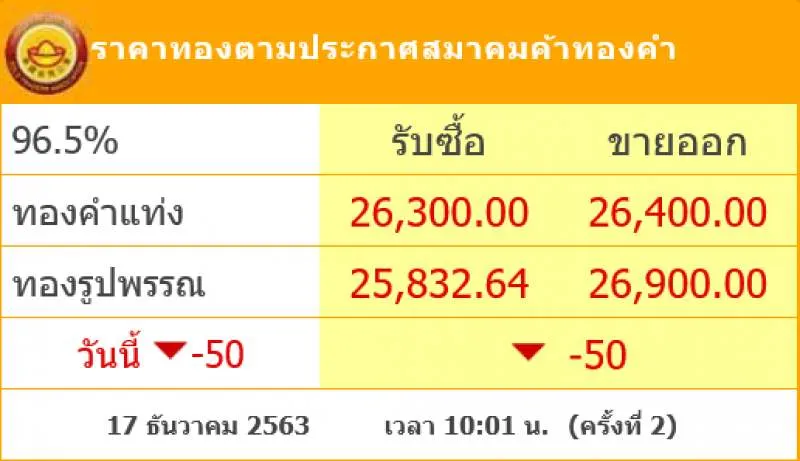 ล่าสุด เวลา 10.01 น. มีการปรับราคาลงในครั้งที่ 50 บาท ส่งผลให้ราคาทองคำแท่ง รับซื้อบาทละ 26,300 ขายออกบาทละ 26,400 บาท ส่วนทองรูปพรรณ รับซื้อบาทละ 25,832.64 ขายออกบาทละ 26,900 บาท