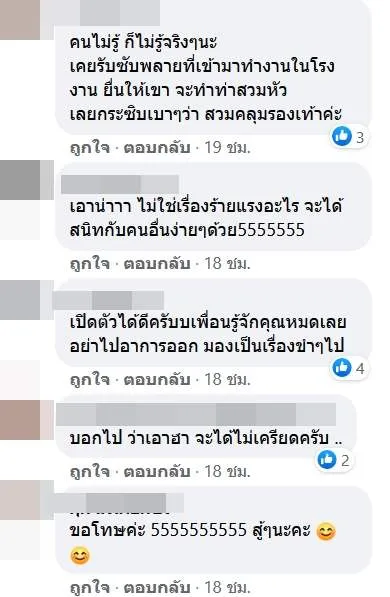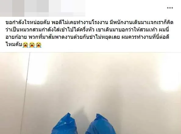 ขอกำลังใจหน่อยคับ พอดีไม่เคยทำงานโรงงาน มีพนักงานเดินมาเเจกเราก็คิดว่าเป็นหมวกสวมกำลังใส่เข้าไปได้ครึ่งหัว เขาเดินมาบอกว่าให้สวมเท้า ผมนี่อายก้อาย พวกที่มาสัมพาดงานด้วยกันขำไม่หยุดเลย ผมควรทำงานที่นี่ต่อดีไหมคับ