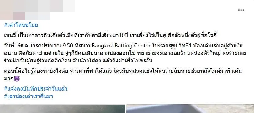 วันที่16ธ.ค. เวลาประมาณ 9:50 ที่สนามBangkok Batting Center ในซอยสุขุมวิท31 น้องเดินเล่นอยู่ด้านในสนาม ติดกับตาข่ายด้านใน จู่ๆก็มีคนเดินมาลากน้องออกไป พยายามจะเอาลอดรั้ว แต่น้องตัวใหญ่ คนร้ายเลยร่วมมือกับผู้สมรู้ร่วมคิดอีก2คน จับน้องใส่ถุง แล้วดึงข้ามรั้วไปซะงั้น