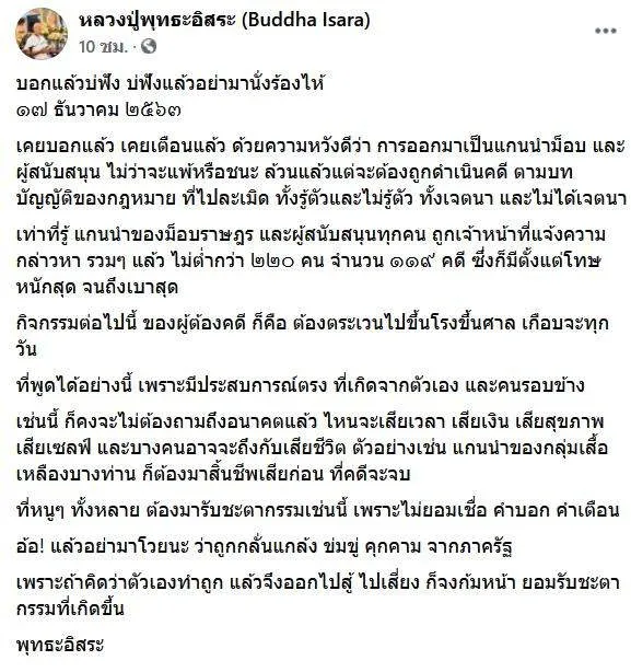 สุวิทย์ หรือ อดีตพระพุทธอิสระ เย้ยกลุ่มราษฎร ถูกคดีนับร้อย ชี้เตือนแล้วแต่หนูๆไม่ฟัง ก็รับกรรมไป ซัดอย่ามาอ้างว่าถูกกลั่นแกล้งจากเจ้าหน้าที่รัฐ