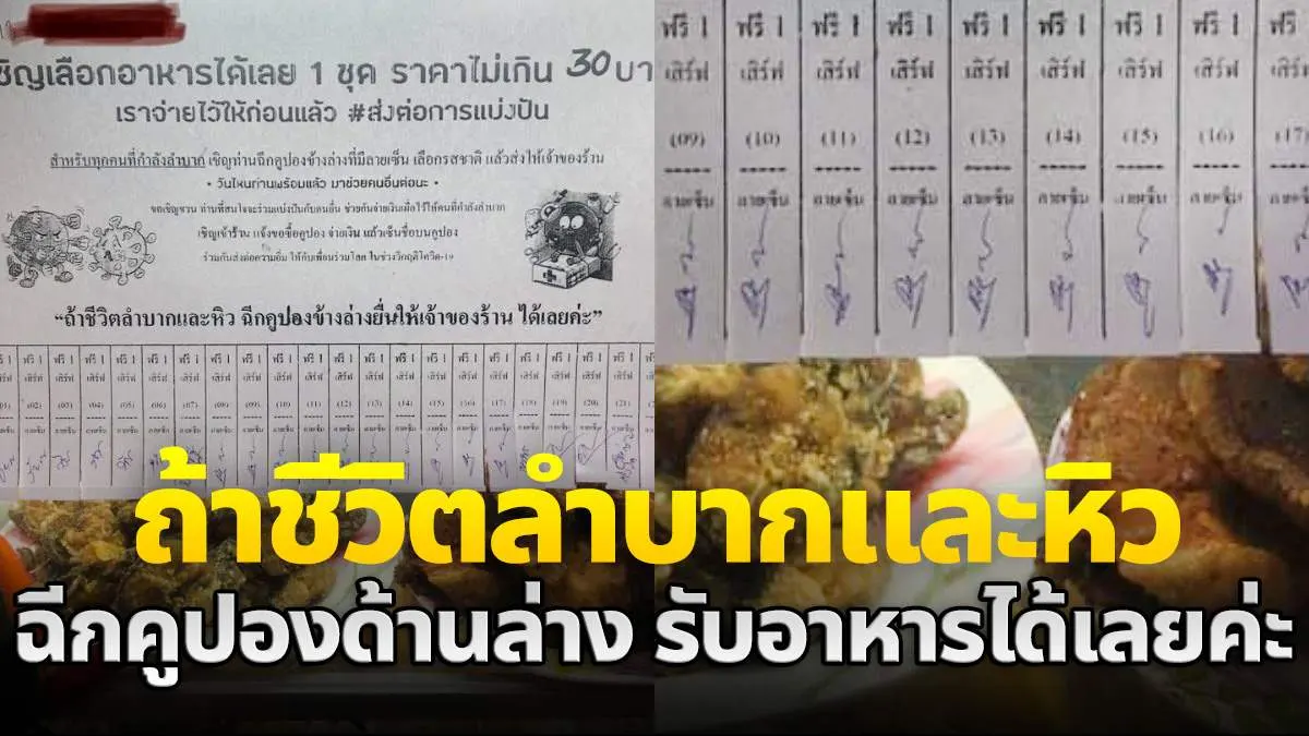 “สำหรับทุกคนที่กำลังลำบาก เชิญท่านฉีกคูปองข้างล่างที่มีลายเซ็น เลือกรสชาติ แล้วส่งให้เจ้าของร้าน วันไหนท่านพร้อมแล้ว มาช่วยคนอื่นต่อนะ” อ่านมาถึงตรงนี้ผมรู้สึกตื้นตัน