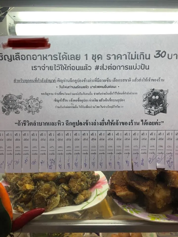 “มีคนฉีกกระดาษบ้างไหม” ผมถามพี่คนที่ทำหน้าที่เรียกลูกค้าและเก็บเงินเมื่อเห็นกระดาษและข้อความพร้อมริ้วที่มีคนเซ็นชื่อเอาไว้หลายชื่อ นั่นแสดงถึงการจ่ายเงินล่วงหน้าของใครสักคน เพื่อให้ใครสักคนที่ไม่รู้จักได้มากินข้าวโดยไม่ต้องจ่าย