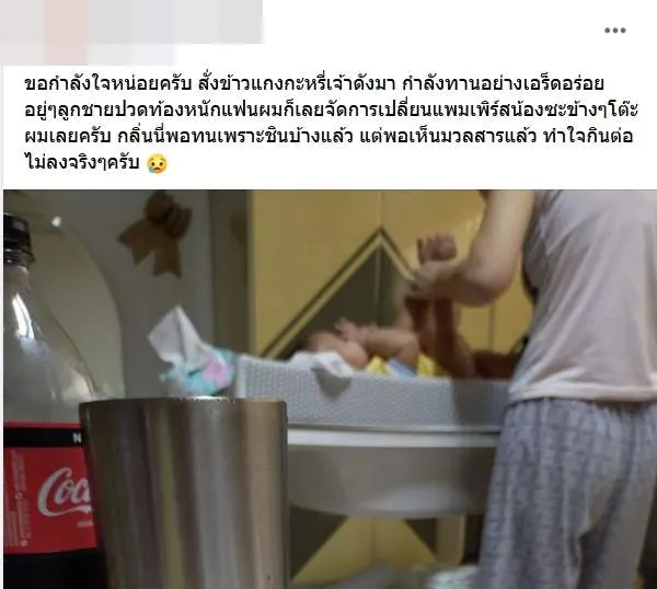 สั่งข้าวแกงกะหรี่เจ้าดังมา กำลังทานอย่างเอร็ดอร่อย อยู่ๆลูกชายปวดท้องหนักแฟนผมก็เลยจัดการเปลี่ยนแพมเพิร์สน้องซะข้างๆโต๊ะผมเลยครับ กลิ่นนี่พอทนเพราะชินบ้างแล้ว แต่พอเห็นมวลสารแล้ว ทำใจกินต่อไม่ลงจริงๆครับ