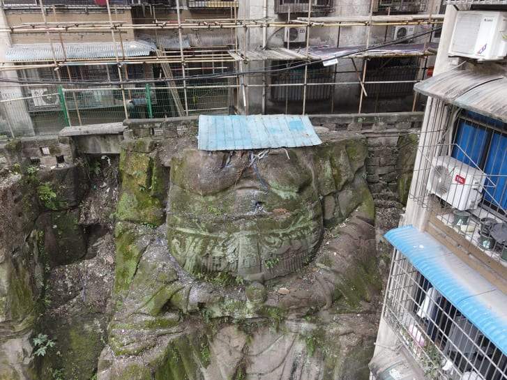หลายปีที่ผ่านมา ผู้อยู่อาศัยในย่านเก่าแก่ ของเมืองฉงชิ่ง ทางตะวันตกเฉียงใต้ของจีน ได้เดินผ่านอาคารอพาร์ตเมนต์ 2 หลัง ที่สร้างขึ้นบนทางลาดชัน โดยไม่สนใจสิ่งที่อยู่ข้างใต้ นั่นคือรูปปั้นทางศาสนาขนาดยักษ์ ที่แกะสลักเป็นหน้าหิน