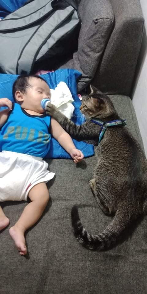 โมเมนต์สุดน่ารัก เจ้านายไม่อยู่ เจ้าเหมียวต้องกลายเป็นพี่เลี้ยงเด็ก เจ้าเหมียวตัวนี้มีชื่อว่า คีอานู มันดูแลดีมาก คอยนั่งอยู่ข้างๆ หนูน้อยไม่ห่างกาย แค่นั้นยังไม่พอ มันยังคอยป้อนจุกนมและยื่นขามากอดอีกด้วย