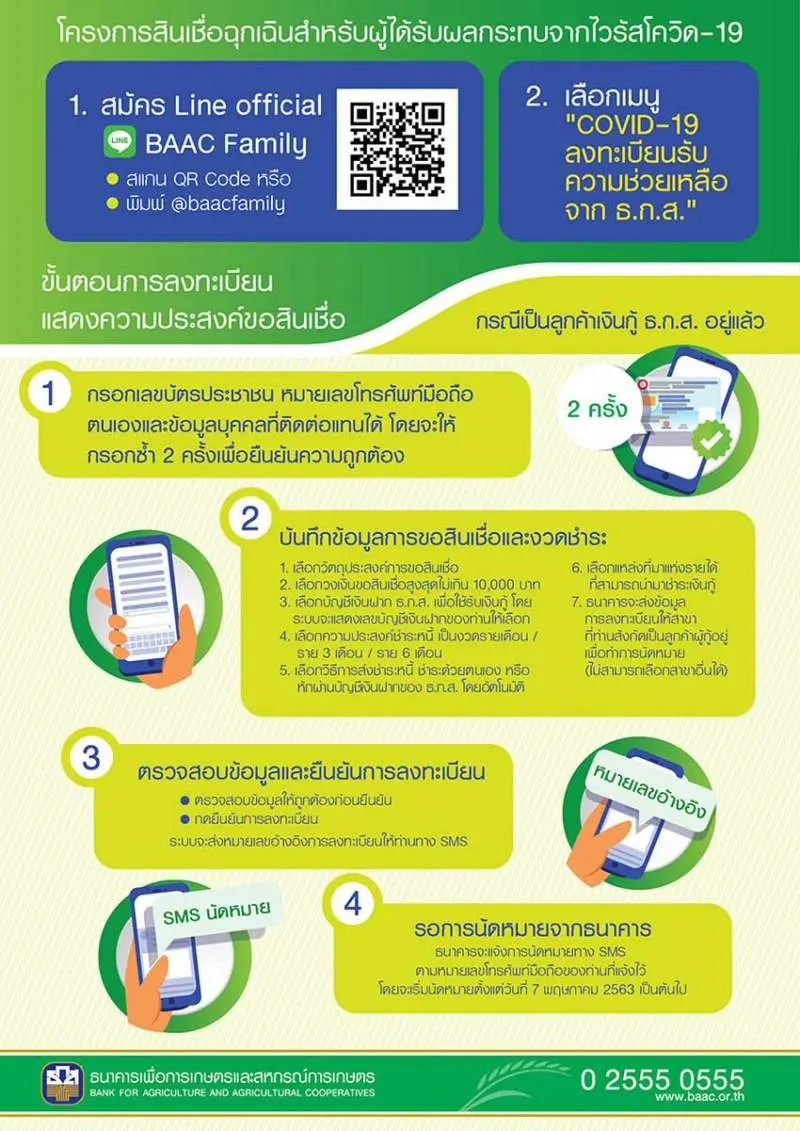 ธ.ก.ส. เปิดให้ลงทะเบียนขอสินเชื่อฉุกเฉินสำหรับผู้ที่ได้รับผลกระทบ วงเงินกู้สูงสุด 10,000 บาท อัตราดอกเบี้ย 0.10% หรือเพียงแค่ 10 บาท! โดยผ่อนชำระนาน 24 เดือน ปลอดชำระเงิน 6 เดือนแรก โดยเปิดลงทะเบียนผ่านช่องทางไลน์ BAAC Family เท่านั้น