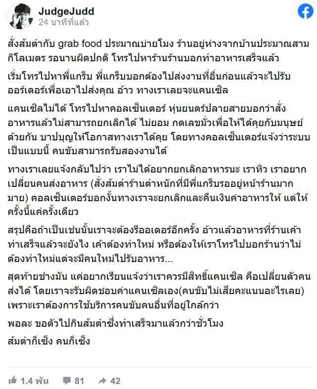 ทางเราเลยแจ้งกลับไปว่า เราไม่ได้อยากยกเลิกอาหารนะ เราหิว เราอยากเปลี่ยนคนส่งอาหาร (สั่งส้มตำร้านตำหนักที่มีพี่แกร็บรออยู่หน้าร้านมากมาย) คอลเซ็นเตอร์บอกงั้นทางเราจะยกเลิกและคืนเงินค่าอาหารให้ แต่ให้ครั้งนี้แค่ครั้งเดียว