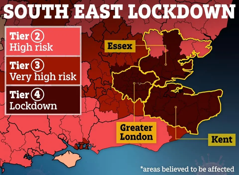 คำสั่งใหม่ งดการจัดคริสต์มาส ร้านที่ไม่จำเป็นเกี่ยวกับดำรงชีพต้องปิด ร้านอาหารให้ซื้อกลับบ้าน มีข้อห้ามงดการเดินทางเข้าพื้นที่เสี่ยง ให้ประชาชนอยู่บ้านมากขึ้น คำสั่งถูกประกาศไวกว่าแผนเนื่องจาก พบเชื้อไวรัสโควิดสายพันธุ์ใหม่ที่กระจายระบาดอย่างรวดเร็ว