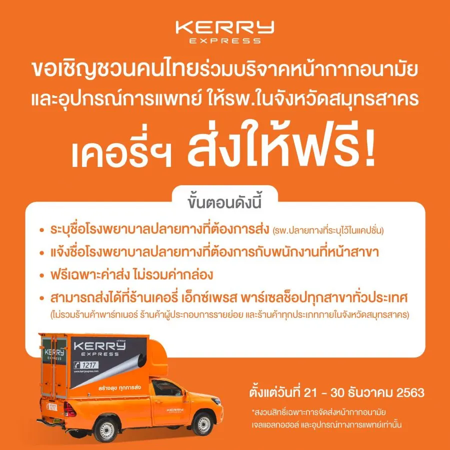 เคอรี่ เอ็กซ์เพรส ชวนคนไทยมาร่วมกันบริจาคหน้ากากอนามัย เจลแอลกอฮอล์ และอุปกรณ์ทางการแพทย์ โดยไม่คิดค่าจัดส่ง ไปยังโรงพยาบาลในเขตจังหวัดสมุทรสาคร ดังนี้