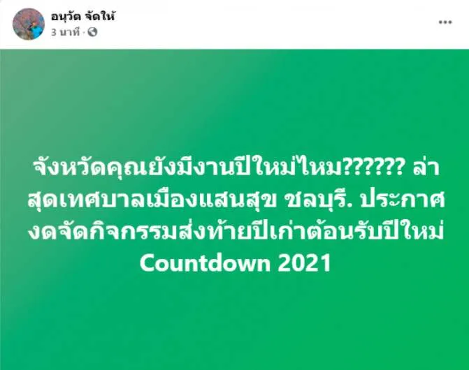 จากสถานการณ์ล่าสุด หลังสมุทรสาคร ประกาศล็อคดาวน์ ล่าสุดเพจ อนุวัต จัดให้ ได้โพสต์ข้อความระบุว่า จังหวัดคุณยังมีงานปีใหม่ไหม ล่าสุดเทศบาลเมืองแสนสุข จังหวัดชลบุรี ประกาศงดจัดกิจกรรมส่งท้ายปีเก่าต้อนรับปีใหม่ Countdown 2021