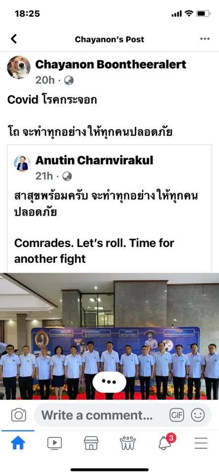 นายอนุทิน ชาญวีรกูล รมว.สาธารณสุข ได้โพสต์เฟซบุ๊กเป็นภาพที่ถ่ายร่วมกับทีมผู้บริหารกระทรวงสาธารณสุข พร้อมข้อความว่า “สาสุขพร้อมครับ จะทำทุกอย่างให้ทุกคนปลอดภัย Comrades. Let’s roll. Time for another fight” โดยมีผู้แชร์โพสต์ดังกล่าวออกไปเป็นจำนวนมาก หนึ่งในนั้น คือ นพ.ชญานนท์ บุญธีระเลิศ ที่แชร์โพสต์ของนายอนุทิน พร้อมเขียนข้อความว่า “Covid โรคกระจอก โถ จะทำทุกอย่างให้ทุกคนปลอดภัย”