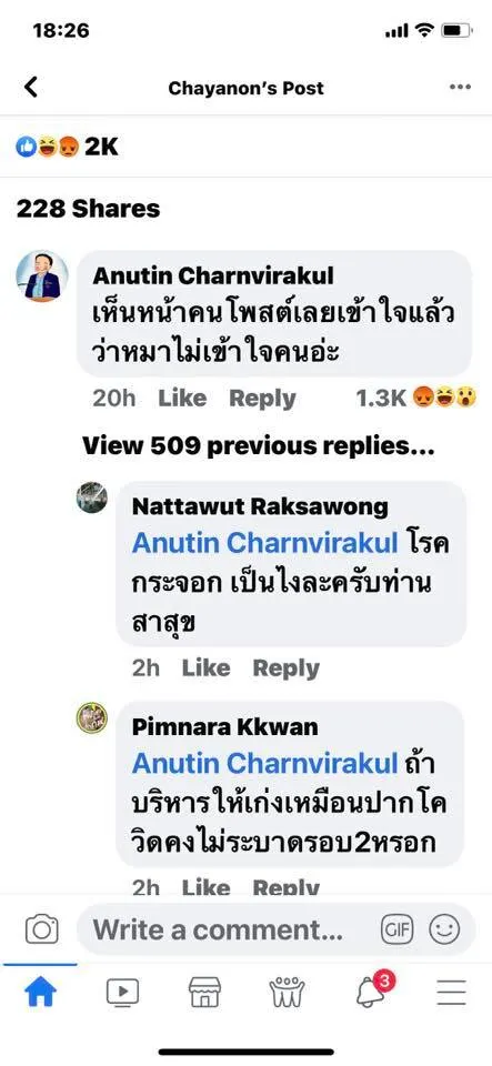 ปรากฏว่า นายอนุทิน ได้เข้าไปคอมเมนต์ใต้โพสต์ในเฟซบุ๊กของ นพ.ชญานนท์ ว่า “เห็นหน้าคนโพสต์เลยเข้าใจแล้วว่าหมาไม่เข้าใจคนอ่ะ” และยังคอมเมนต์ต่ออีกว่า “อยู่ รพ.พะเยาเหรอ เดี๋ยวไปหา มารอรับน้า” ทำให้มีคนเข้ามาต่อว่าและวิพากษ์วิจารณ์นายอนุทินเป็นจำนวนมากว่า ไม่มีวุฒิภาวะ และที่บอกว่าจะไปหานั้นเป็นการข่มขู่หรือไม่