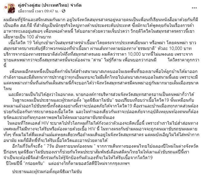 เชื้อโควิด 19 ได้บุกเข้ามาในสมุทรสาครนำเชื้อมาโดยตรงจากประเทศเมียนมา หรือพม่า โดยคนพม่า ชาวสมุทรสาครบางระดับรู้ดีว่าพวกหม่องที่นำเชื้อมา ผ่านเส้นทางตามช่องทาง"ธรรมชาติ" หัวละ 10,000 บาท บริการจากช่องทางธรรมชาติส่งให้ถึงที่สมุทรสาครเลย ผมคิดว่าราคา 10,000 บาทนี้ไม่แพงเลย เพราะจากชายแดนพม่ากว่าจะถึงสมุทรสาครนั้นจะต้องผ่าน "ด่าน" ไม่รู้กี่ด่าน เพื่อนบอกว่าก่อนมี โควิดราคาถูกกว่านี้